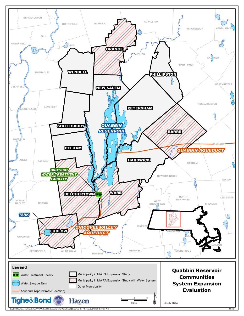 MWRA recently completed a feasibility study to assess the expansion of MWRA’s water system to communities within the Quabbin Reservoir Watershed. The study includes the following communities: Barre, Belchertown, Hardwick, Ludlow, New Salem, Orange, Pelham, Petersham, Phillipston, Shutesbury, Ware and Wendell.
