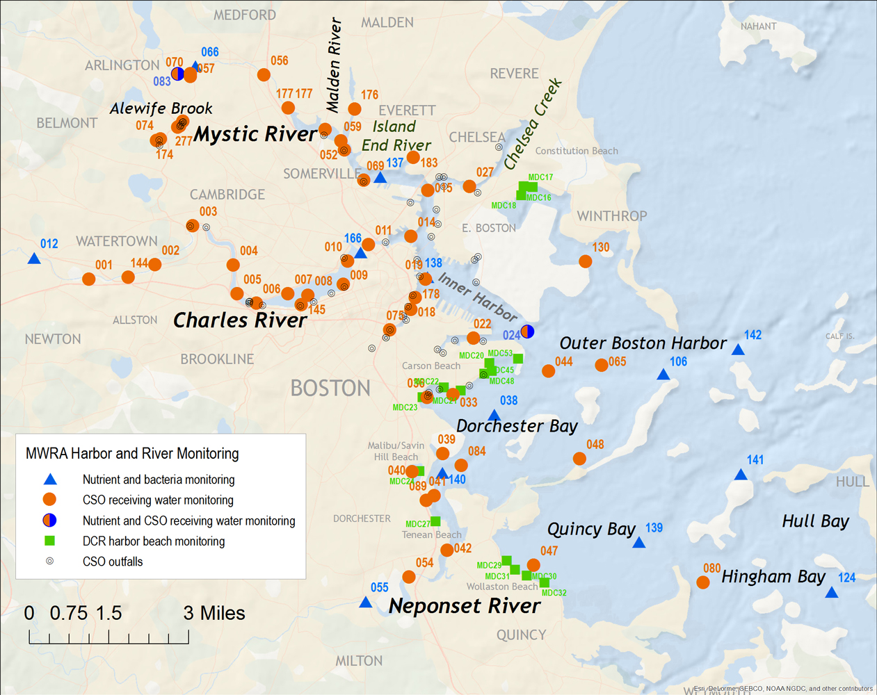 MWRA monitors bacteria at locations surrounding the MWRA outfall and elsewhere in Massachusetts Bay (see station map). Water samples are analyzed for sewage indicator bacteria: fecal coliform and Enterococcus. Fecal coliform is used by the Massachusetts Division of Marine Fisheries to monitor water quality in shellfish areas. Results consistently meet the most stringent Massachusetts water quality standards.