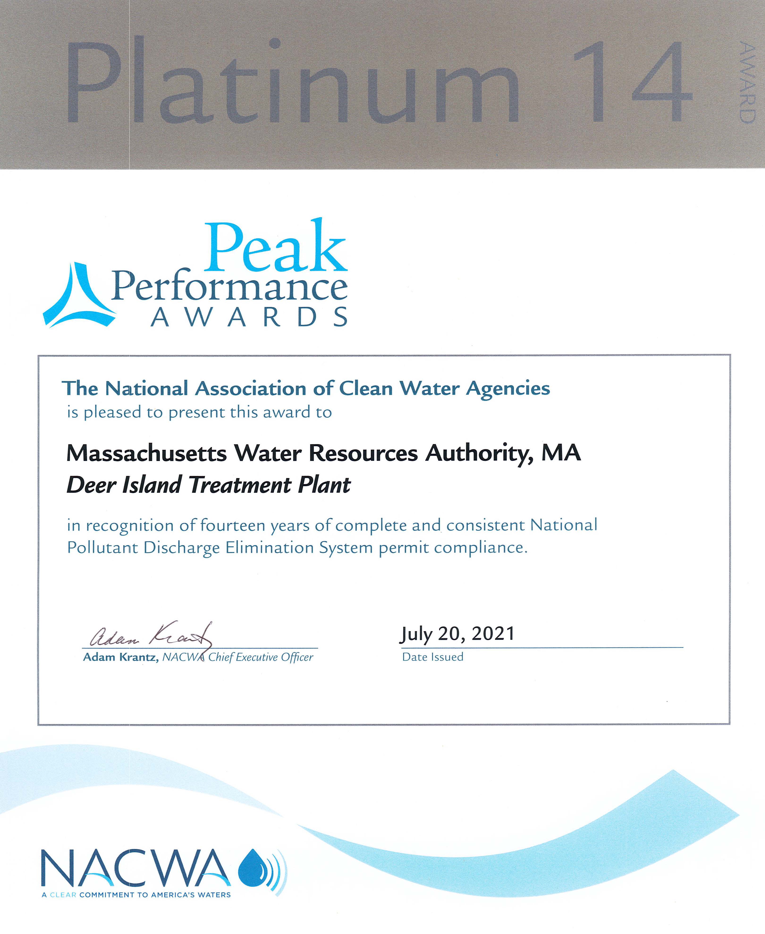 - Deer Island Treatment Plant earned its 15th consecutive Platinum Peak Performance Award from the National Association of Clean Water Agencies for 100% compliance with permit effluent limits;