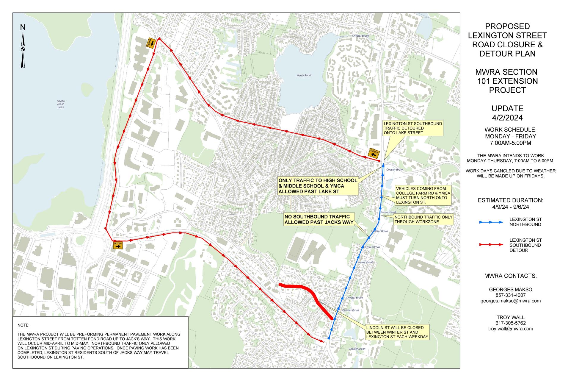 The Section 101 Pipeline Extension project consists of a new 36-inch diameter water main and appurtenances extending from MWRA’s Meter 182 at the Waltham/Lexington town line down Lexington Street to Totten Pond Road, where it will connect to Waltham’s water system. This connection will provide a new redundant water supply to Waltham’s Prospect Hill Service area from the NEH pressure zone and to MWRA’s Lexington Street Pumping Station. In an emergency, the pipeline will provide a partial water supply to MWRA’s NEH pressure zone from the Lexington Pumping Station. This new water main will provide sufficient capacity to maintain water service to Waltham during the anticipated shutdown of MWRA’s WASM 3 pipeline and the Lexington Street Pumping Station for future rehabilitation.